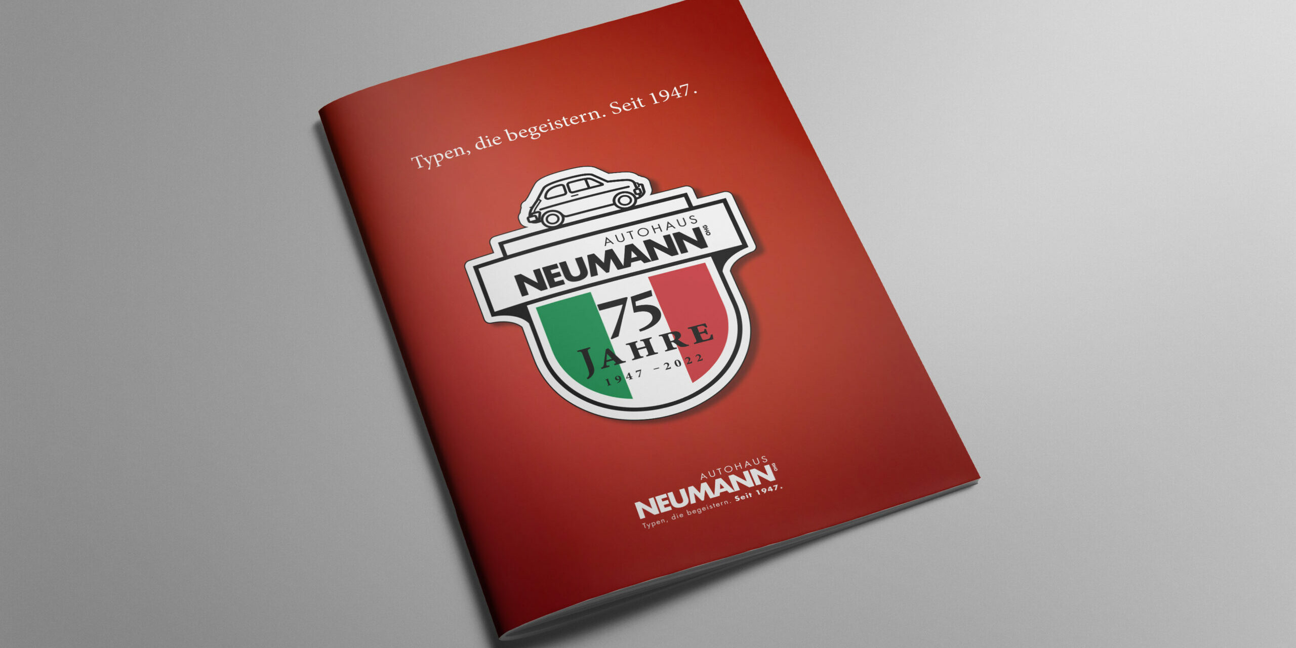 Bereits seit 1980, dem Jahr, in dem FIAT als erste Service-Marke zum Autohaus kam, verbinden die Menschen mit dem Autohaus Neumann nicht nur „Benzin im Blut“ (bzw. seit Neuestem auch Lithium-Ionen in den Adern), sondern eben auch pure italienische Leidenschaft. Mit den Marken ALFA Romeo und JEEP (Teil der Stellantis AG, zu der auch FIAT gehört) wurde diese Tradition in den Folgejahren erfolgreich weitergeschrieben. Diese „mediterrane“ Leidenschaft kommt auch im Jubiläums-Logo des Autohauses eindrucksvoll zum Tragen: Über dem Schriftzug des Autohauses erscheint die Silhouette eines Retro-Fiat 500, dazu stolz und prominent darunter die italienischen Farben. Je nach Werbemittel wird das neue Key-Visual mit den Claim „Typen, die begeistern. Seit 1947“ abgerundet. Unterm Strich: ganz viel Leidenschaft. Ganz viel Individualität. Ganz viel Autohaus Neumann! Exakt diese persönliche Leidenschaft spürt man nicht nur in der Jubiläumsbroschüre auf jeder der 48 Seiten, sondern auch in der Funkspotkampagne sowie in weiteren Jubiläumsmaßnahmen wie den verschiedenen OOH-Werbemitteln (u.a. Fahrzeugbeschriftungen).
